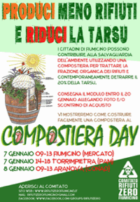 i cittadini a ridurre attivamente i rifiuti di natura organica (residui vegetali, frutta, verdura ecc.) attraverso la messa in atto di comportamenti virtuosi del singolo cittadino che vorrà aderire . Volete imparare ad usare la compostiera domestica e ridurre così la tarsu del 20%? Non mancate agli incontri che si terranno il 7 gennaio dalle 9 alle13 al mercato di Fiumicino, il 7 gennaio 14-18 PAM di Torrimpietra e l’8 gennaio 9-13 ad Aranova alla Conad. Affrettatevi dovrete consegnare il modulo per l’adesione al compostaggio domestico entro il 20 gennaio allegando foto e/o scontrino di acquisto della compostiera .