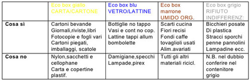 Ogni casa o condominio deve avere almeno 4 contenitori di colore diverso dove porre una sola categoria di rifiuti, facciamo qualche esempio non esaustivo: