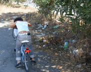 Fregene Aprile 2008. Su Viale Viareggio ci starebbe bene un percorso ciclo-pedonale. ma no! invece si vogliono costruire altre case! ma a chi serviranno tutte queste case se poi mancano le infrastrutture per far vivere decentemente le persone. L’importante sembra far felici e ricchi i costruttori e chi da loro i permessi per fare tutto cio’. il resto non conta. Ecco una bimba che si riposa, dopo un giro in bicicletta, vicino ad una delle tante aiuole di fregene piene di rifiuti ! bello spettacolo!