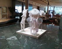 Con la carta da recupero, nascono forme pulite e rigorose frutto di grande abilità manuale, in quanto la carta si presta anche a essere modellata, plasmata, lavorata .La duttilità del materiale dà vita a raffinati gioielli di carta, e può anche raccontare tante vite come le figure maschile e femminile, realizzate in carta bianca, con riferimento al ‘700 veneziano. Il futuro è proiettato nell’arte e nel design e la carta, materia di origine organica, oggi sempre più protagonista, è il trionfo dell’effimero .
